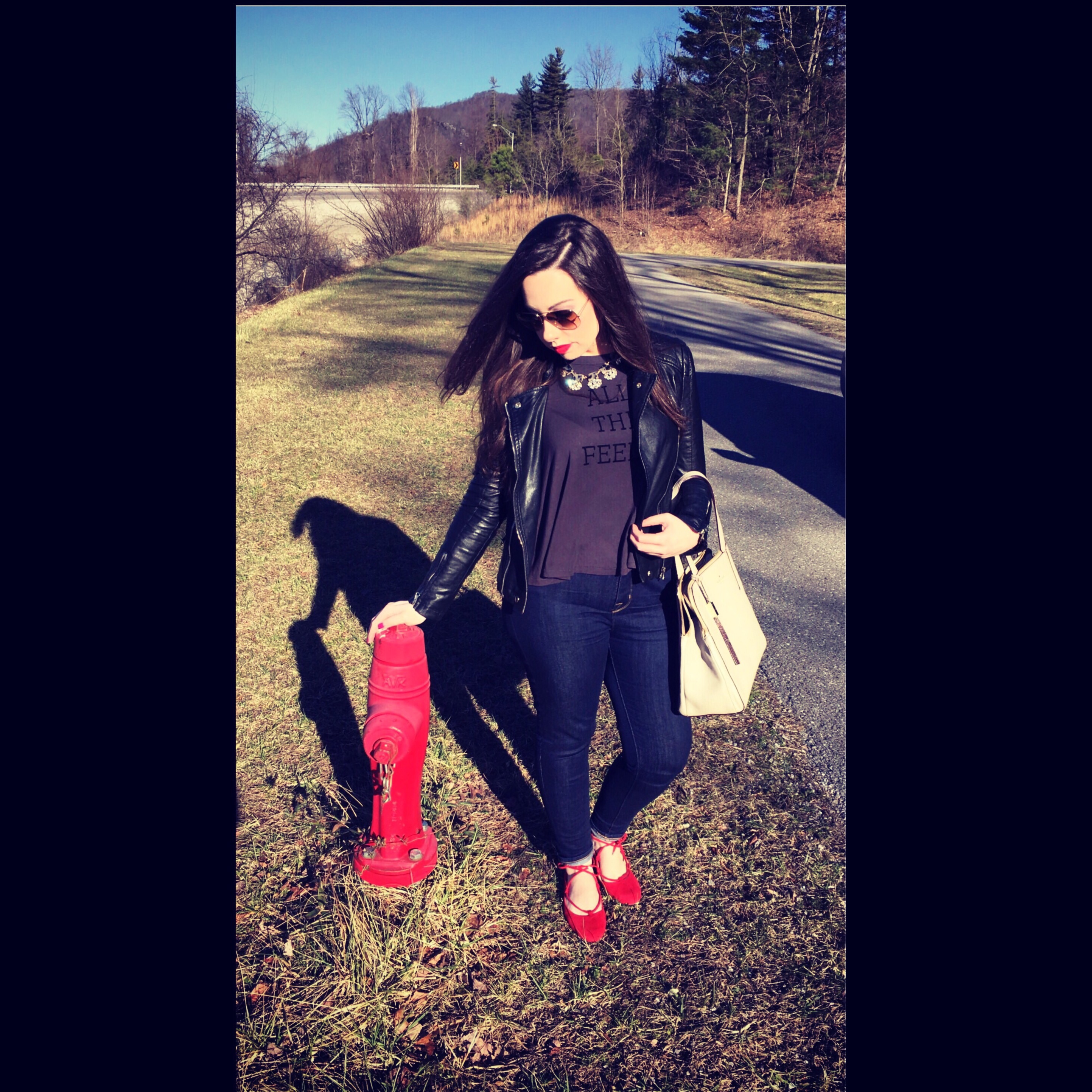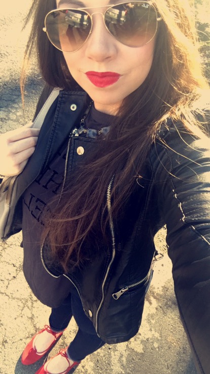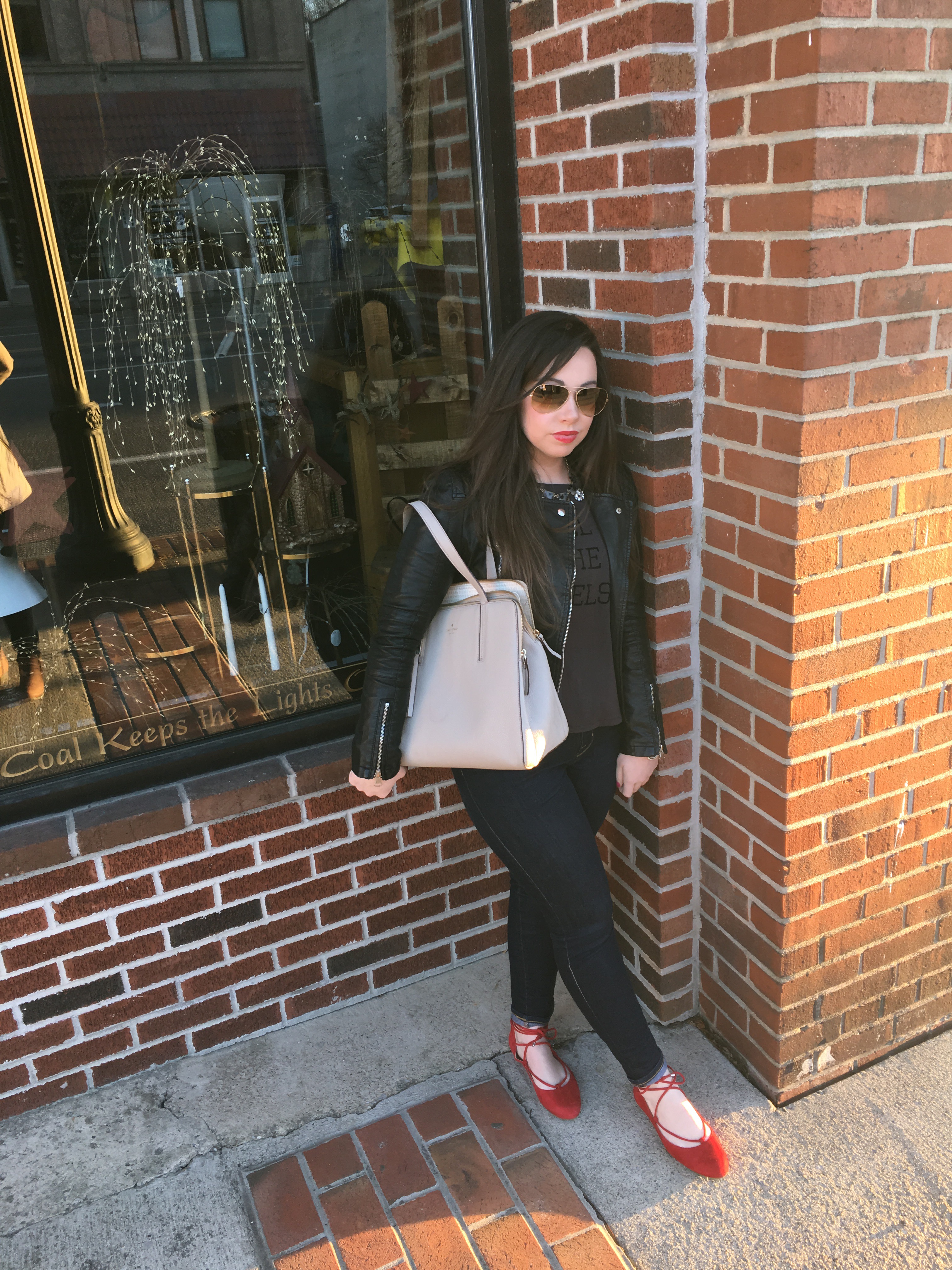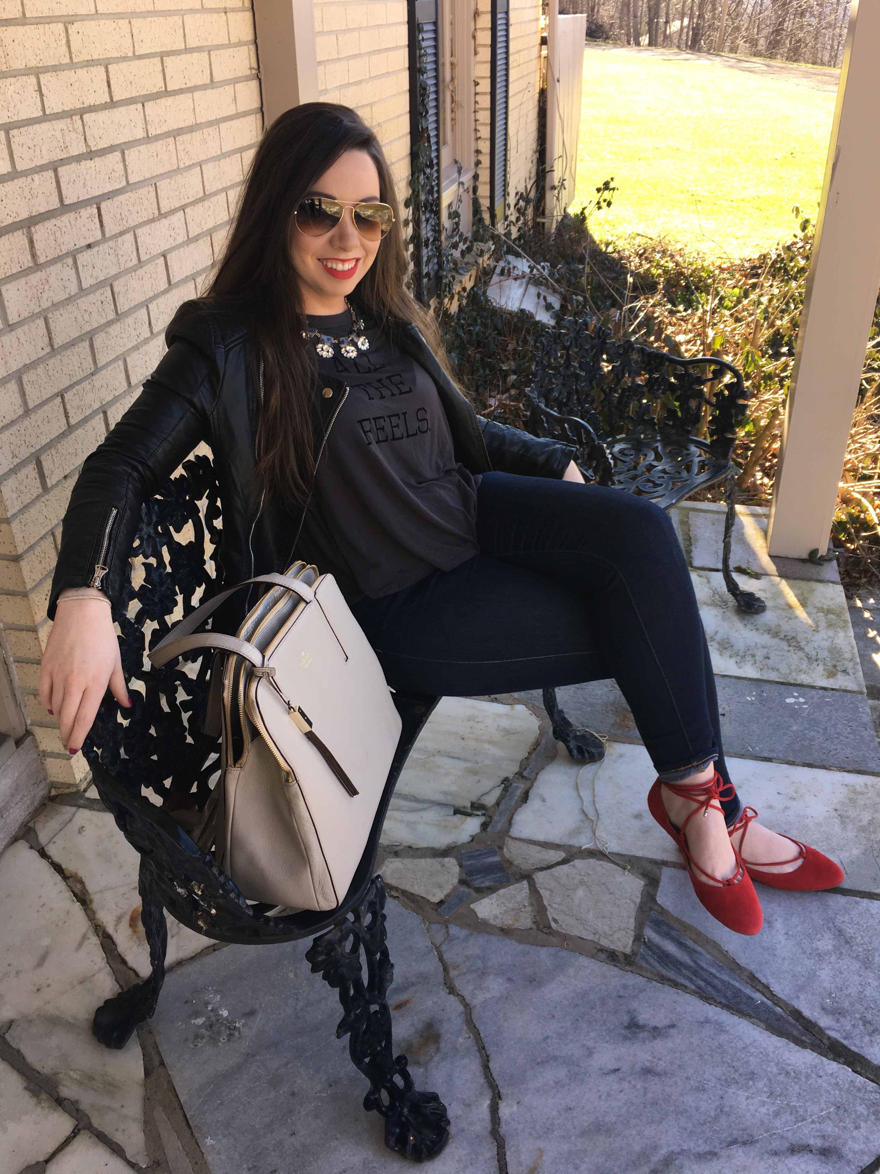 I’m obsessed with these red flats. I looked for forever for the perfect pair. I wanted them to lace up around my ankles, and be the perfect shade of red that I was looking for. I matched my lipstick with the shoes to give the perfect color pop to a dark ensemble. AND this Kate Spade bag is everything you could ever want and more. It is such a versatile color you can literally wear it with anything at any time of year. I purchased my purse at the Kate Spade outlet, and that’s definitely what I would recommend doing because the prices on the regular Kate Spade website are pretty outrageous at times.