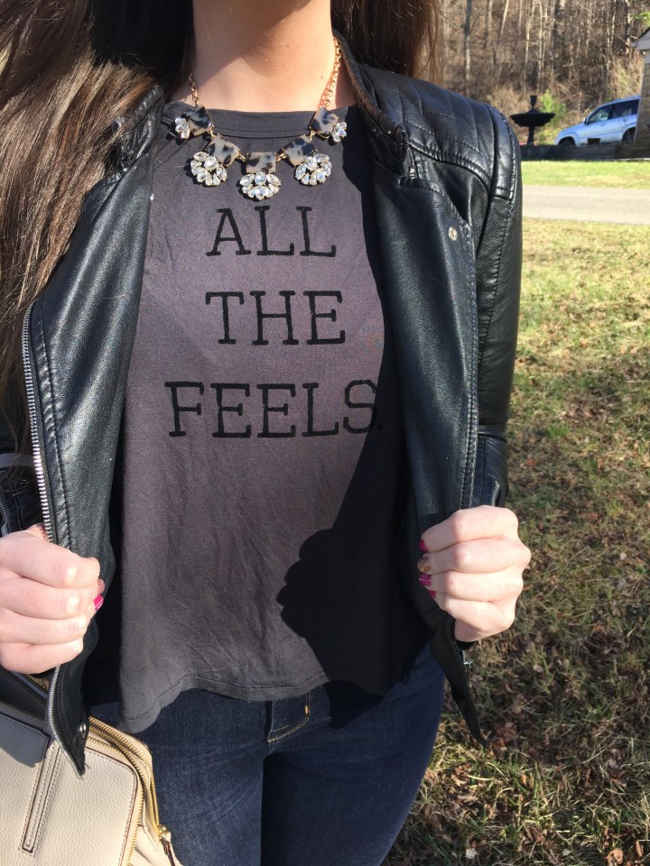 Anybody else always in the feels? I couldn’t help myself with this cute little graphic tee that describes me perfectly. You may have caught my first post, and it could have been interpreted that I didn’t like graphic tees… but I was referring to logo tees. They might be for some people, but personally they’re not my favorite. Now, this type of graphic tee is right up my alley. It’s cute, and it gets the point across, but it doesn’t scream look at me. Ya know what I mean?