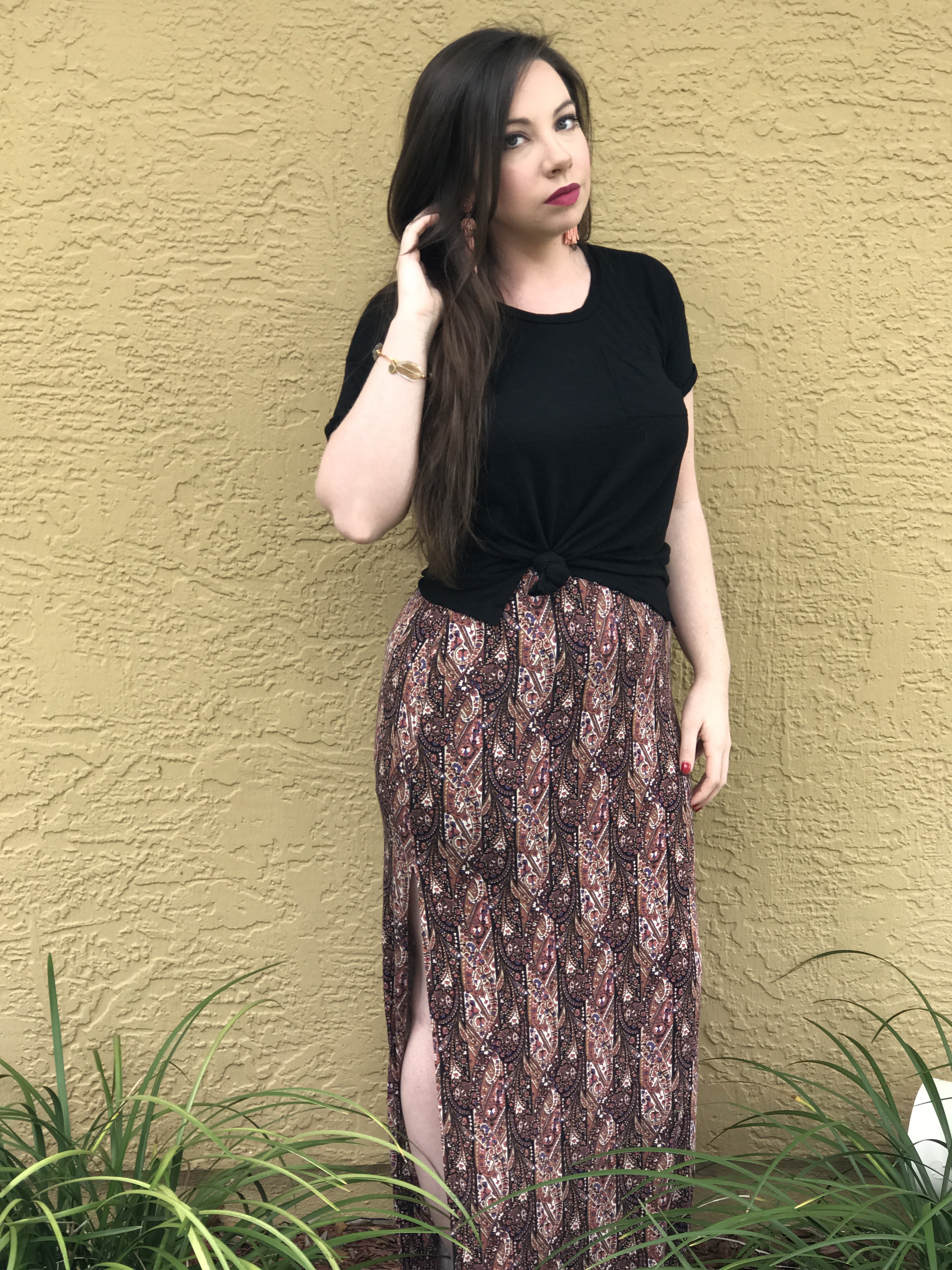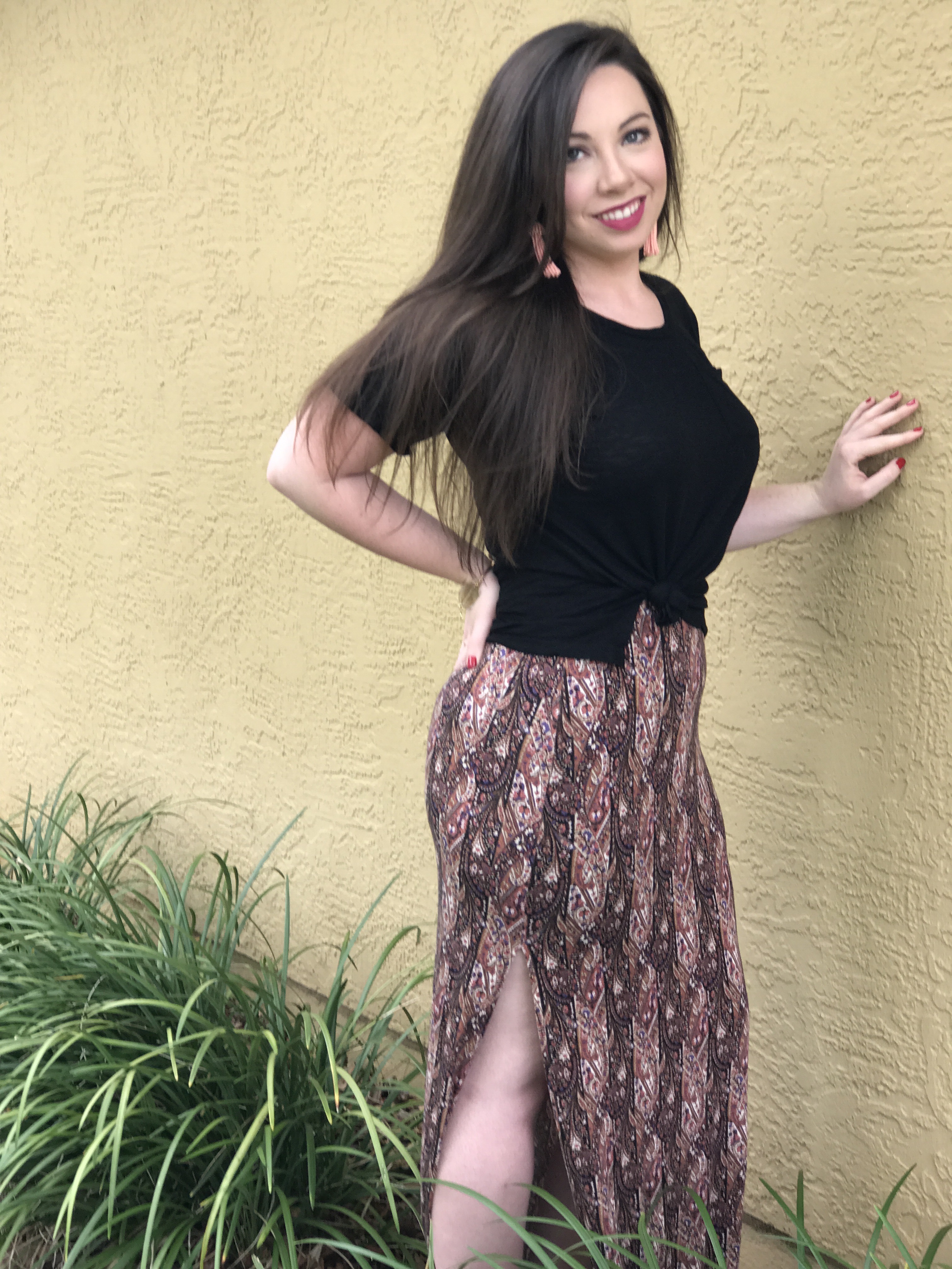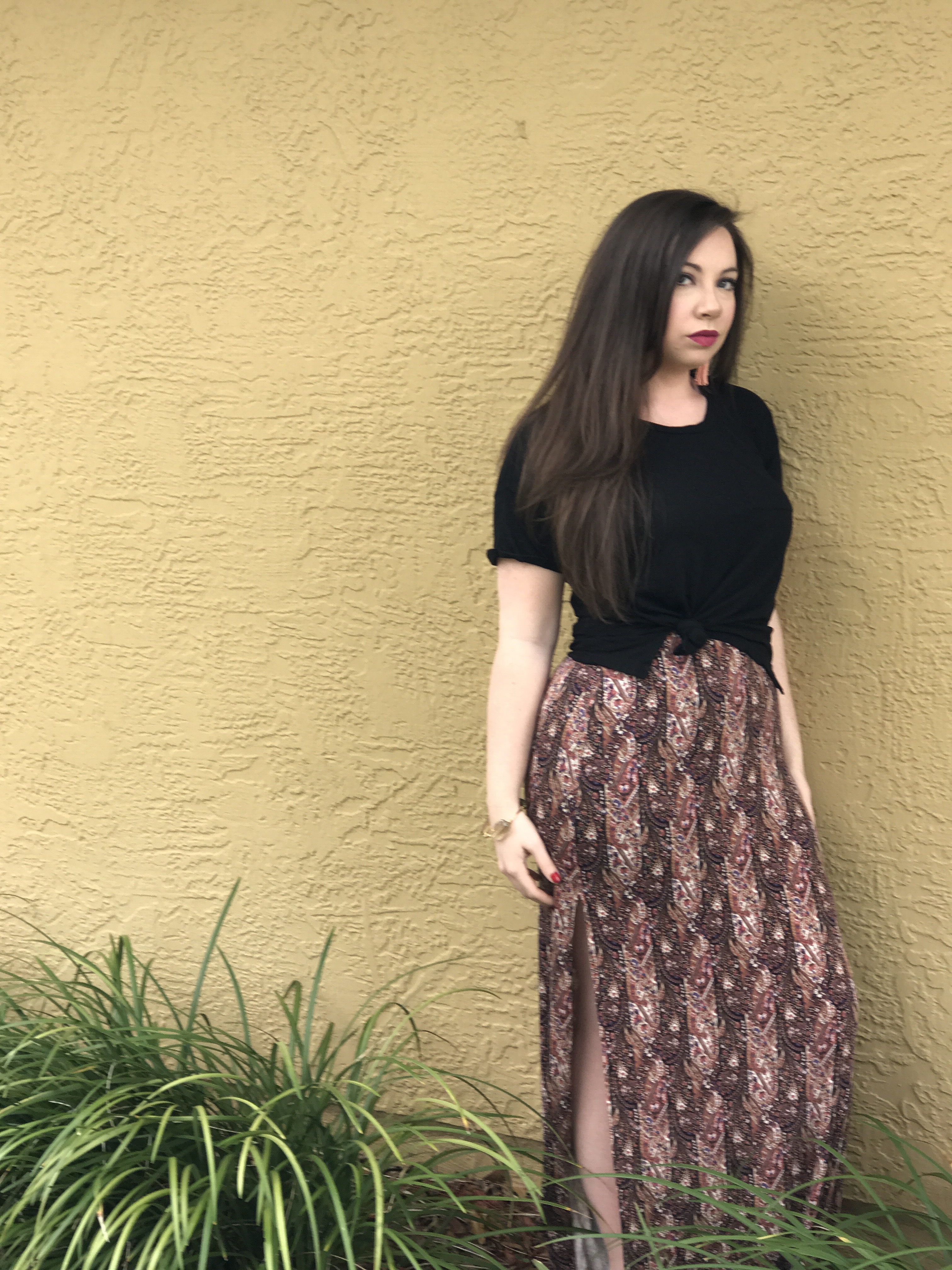 I paired this boho maxi (hi-waisted) skirt with a basic pocket-tee. The only difference is that I wanted to show the hi-waist on this adorable skirt. So, again I made my personality show by tying a knot in the shirt to make it cropped. It gave me a defined waist, and that’s my style. Personally, I have to have something with structure and a defined silhouette for it to look good on me. (And to feel comfortable with myself) I know we all have those little things that we do and don’t like about how an outfit looks on us. Hence, the reason I shortened the top. Just how I like it!