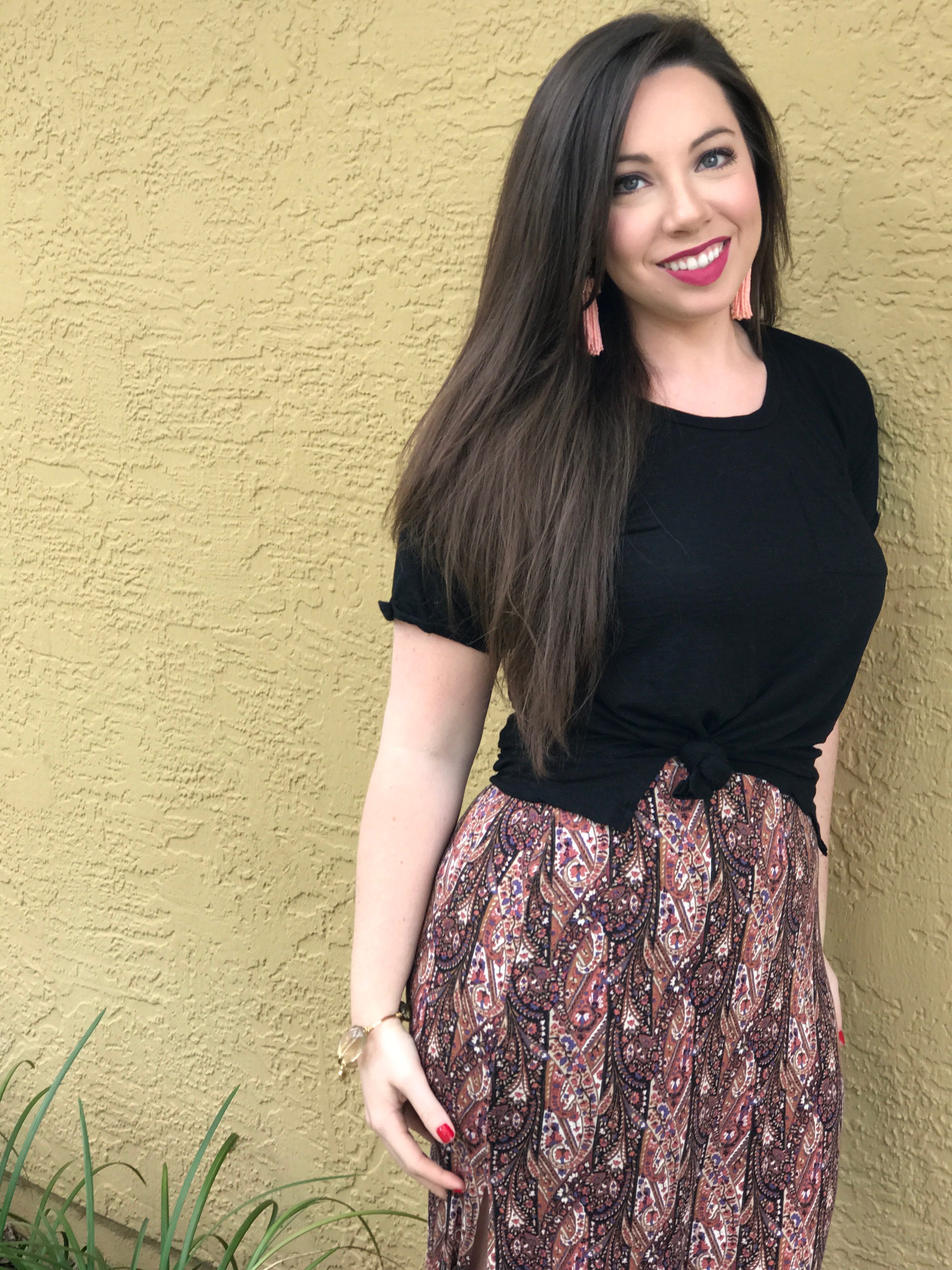 Y’all ever heard of Lisi Lerch? They have the most adorable beaded tassel earrings. However, they are a bit on the expensive side. I purchased the pair I’m wearing at Francesca’s, and I think they look just as adorable as the Lisi Lerch brand. If I were going to splurge I would definitely get the aqua pair made my Lisi, but for now these are a more versatile color for my wardrobe. (Also, these were a lot less expensive) The accessories with this outfit are pretty simple. This is mainly because I felt with the busy pattern of the skirt it didn’t need to be accessorized to the extreme. The skirt speaks for itself.
