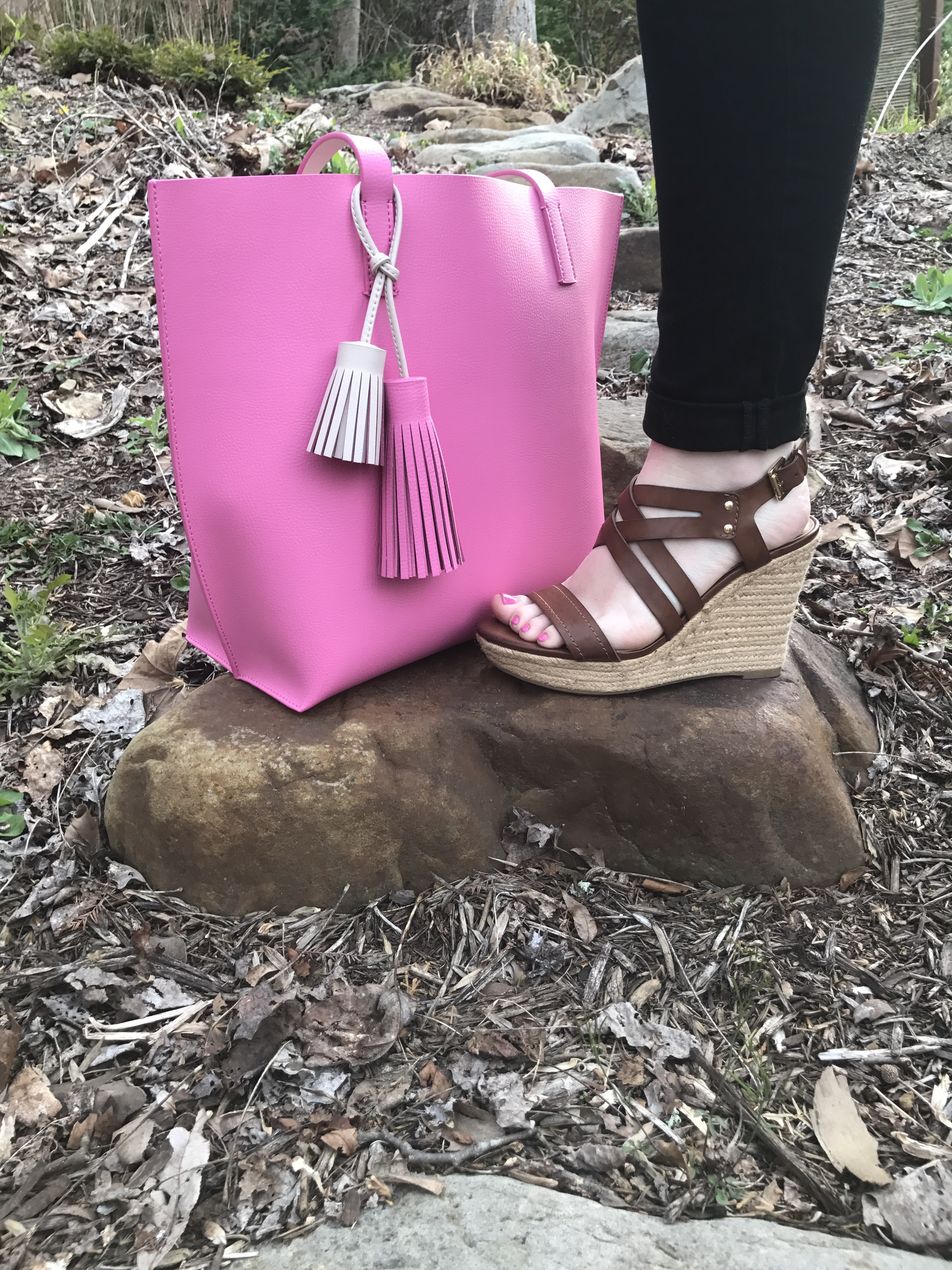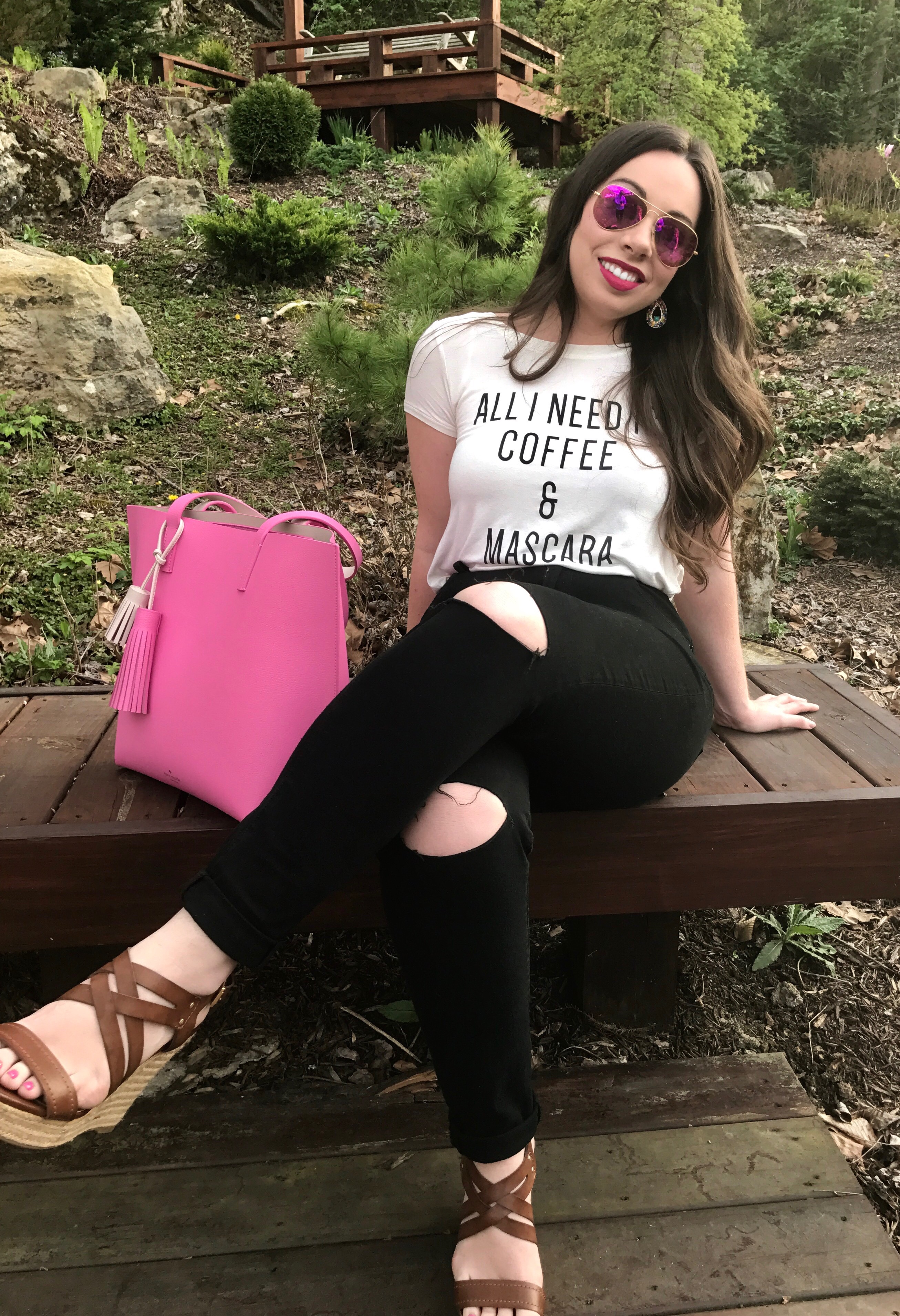 The shirt says it all, my dears. Coffee and Mascara are some of my favorite things. A Dunkin Donuts Carmel iced coffee specifically and the blackest black mascara you can find. Sometimes being a girl is fun. Putting on mascara is one of those times for me. I love it with everything in me. My graphic tee is the exact same style as my “all the feels” graphic tee featured in an earlier post. Aerie has the cutest/ softest tees on the market. 10/10 recommend them. My favorite part about this tee is the scoop-back. This feature makes it girly, fun, and different than any other plain graphic tee. I love little details as such, and I’m constantly looking to find unique styles for my wardrobe. These BDG jeans are some of my favorites because they’re so SO comfortable. They’re stretchy and you can’t even tell you’re wearing jeans. My favorite kind. The outfit itself was pretty simple with the black and white colors. So, I added the pop of pink tote. It’s my newest favorite item for spring. The pictures really don’t do it justice. And the tassels just set it off. I’m obsessing over any kind of tassel this season. They’re hot for spring.🔥 Since we’ve had beautiful weather the past few days I added a simple cognac wedge. Cognac because it’s versatile. Wedges because they’re comfortable. Since it’s spring and colors are big for spring I tried adding little details of color into the ensemble. Slightly pictured are my multicolored earrings. It’s the little details in an outfit that make it unique to you and your style. Make it your own is the best advice I can give you. Lastly, we had a cute little visitor for our photoshoot today. Aunt life is the best life.💕 Links below. XOXO