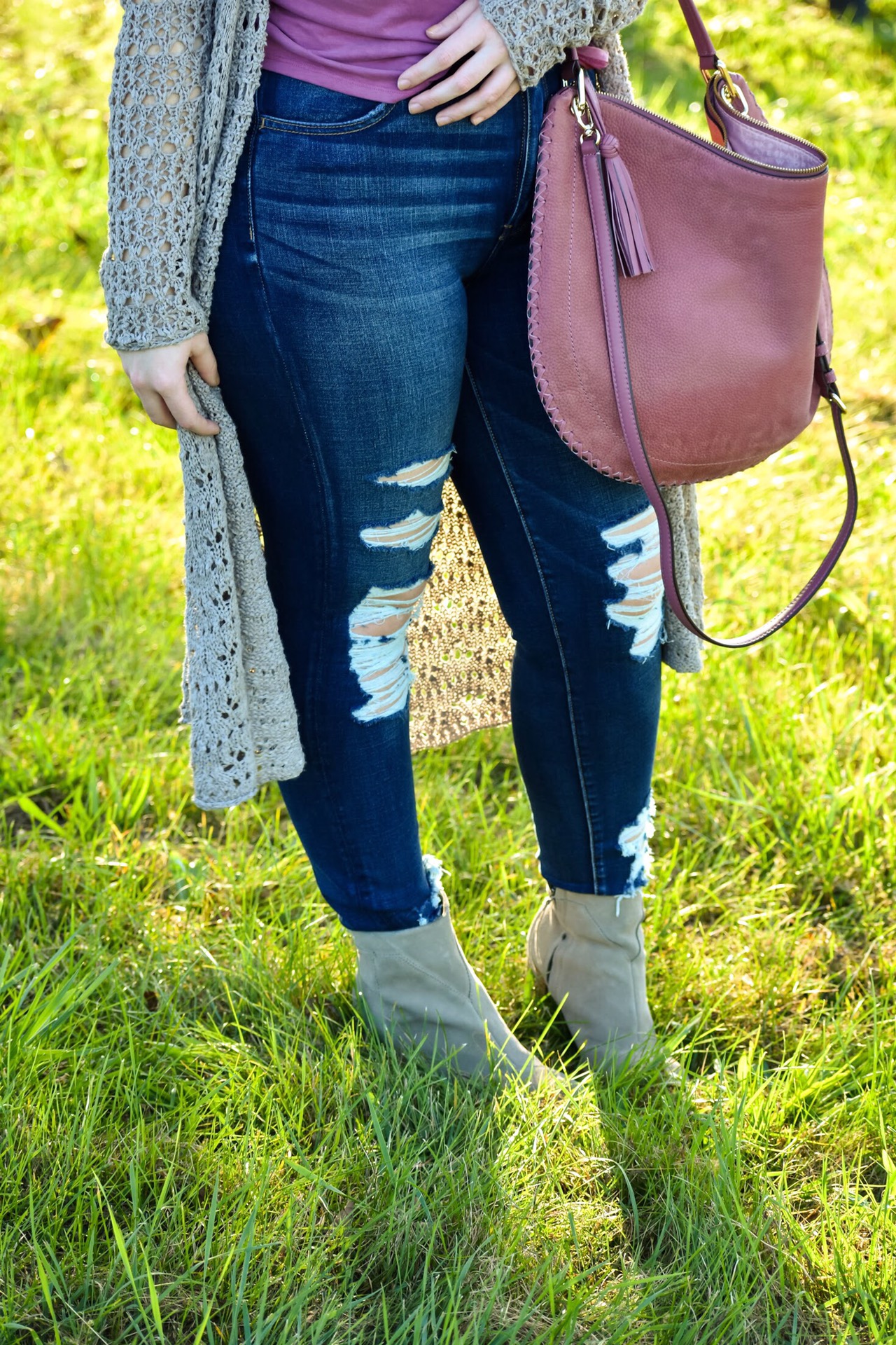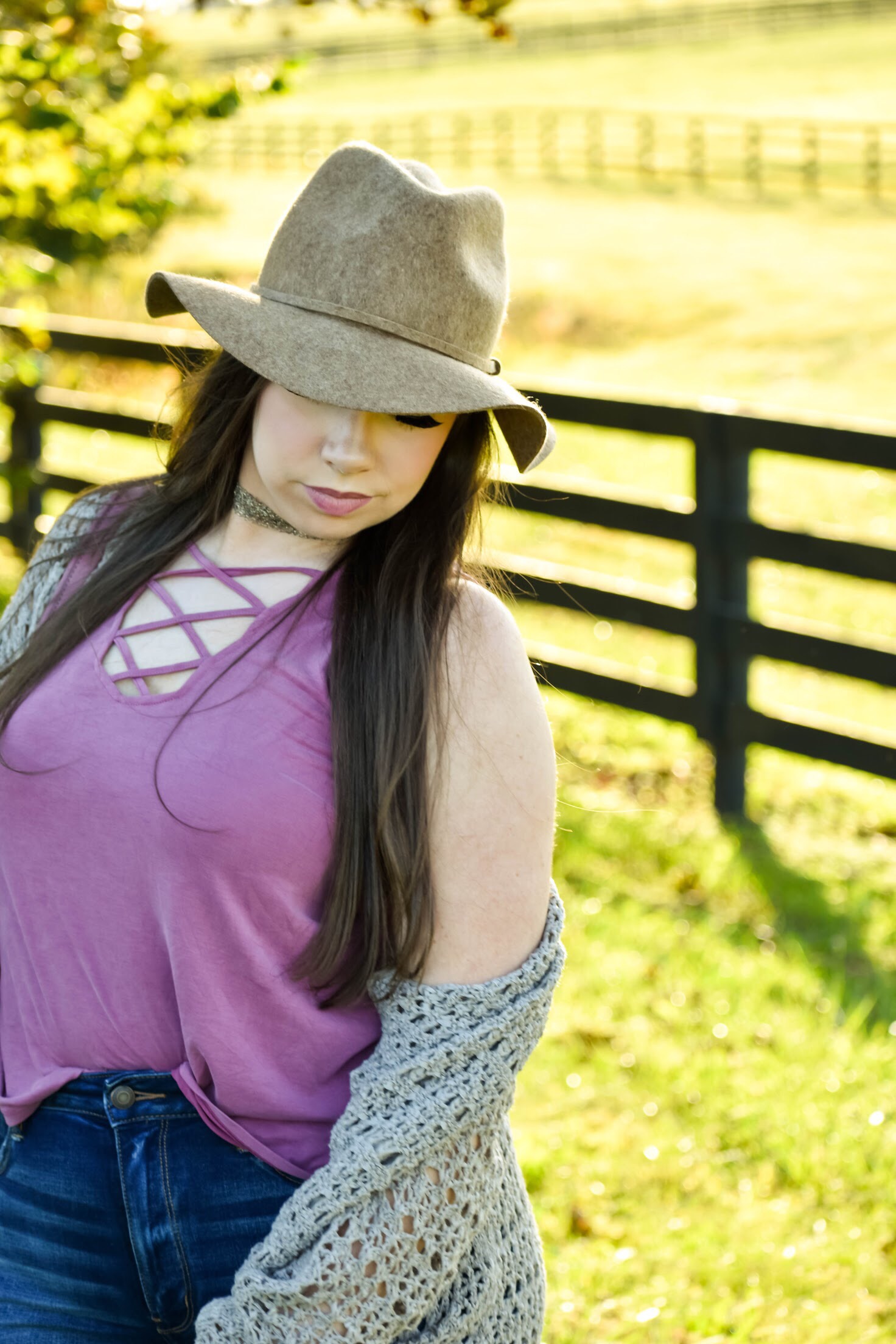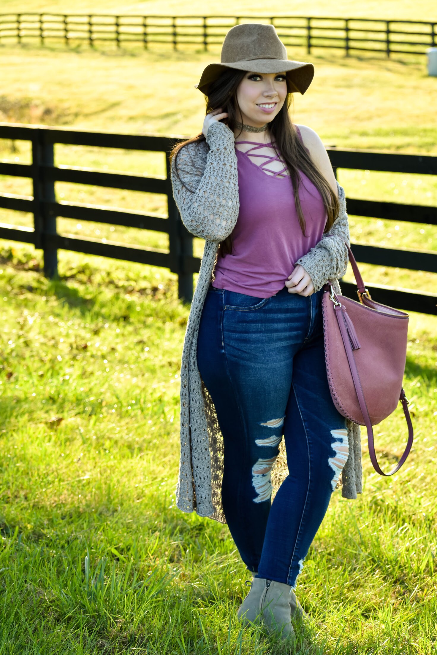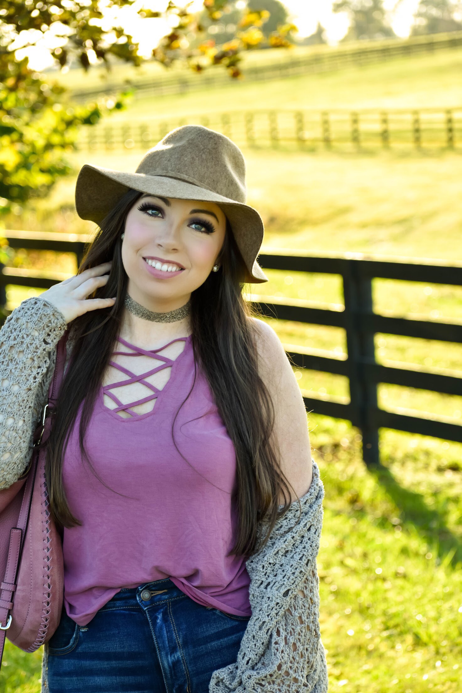 Fall is for layering as I’m sure you already are aware of. As we’ve been seeing here in the lovely KY.. it’s cool in the mornings, but by midday you die of a heat stroke. The best way to dress for both is by layering, of course! With sweaters or cardigans, hats, booties, jeans with holes (because they’re breezy, duh!) You can layer in a multitude of ways. The pieces in this post are essential staples for a fall wardrobe everyone will adore. It’s a fall OOTD, but something about this look reminds me of horse racing?!?! Not really sure why, but with opening weekend of Keeneland I think it’s fitting to share a look such as this. I’m seriously swooning over this purse and shirt because they’re my favorite color right now. Which, you’ve read in earlier posts I adore the color mauve. Seriously freaked when I found this purse at Kate Spade. She just gets me!!! This is a look, I think, that speaks for itself. I would wear this to many different events, and you could definitely take away or add different accessories and shoes to make it a completely different ensemble. You can find the links for a similar look at the bottom of the page. XOXO
