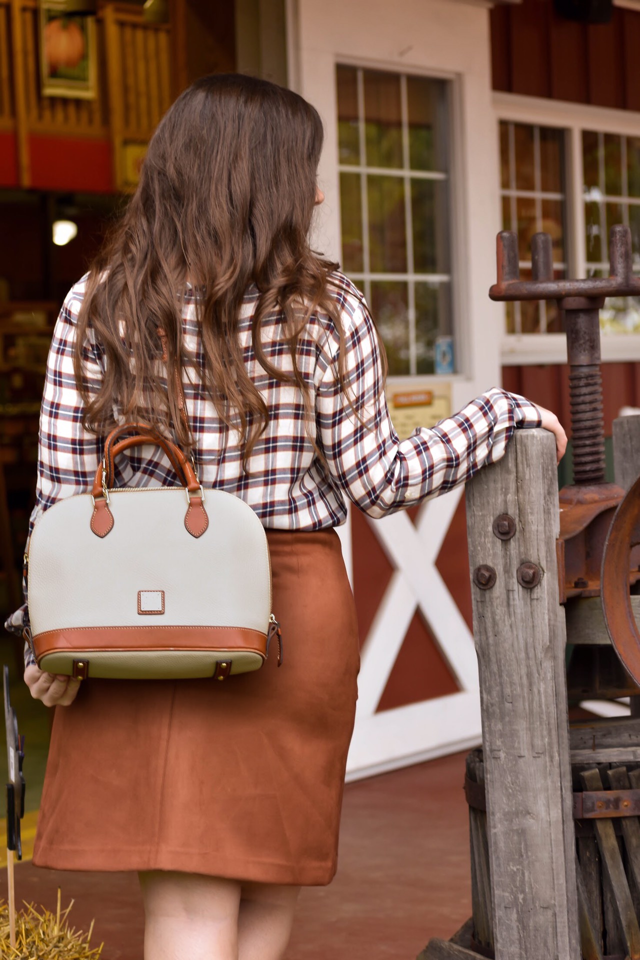 Who doesn’t love a good pumpkin patch? When I think of fall plaid comes to mind. Hence, the reason I went for this super cute plaid blouse. It’s comfy and was light weight, but still kept me warm from the cool breeze that day. Another fall staple I’m loving is suede. Suede is honestly the new black right now. Not sure if you can really tell through the pictures, but this skirt is just all the heart eyes. It’s suede, and the color is so vibrant, plus it has pockets! It’s not your usual cognac that I tend to lean towards in most items, but it’s just a smidgen darker and it had me at hello! Of course my dooney is one of my favorite purses as you already know. It’s a classic that can be carried forever because they never go out of style. Dooney’s are timeless, if you will. I think the versatility of this outfit is really endless. If it were colder I would just add tights, and perhaps a riding boot. That’s what I adore about fashion, the possibilities are infinite. If you haven’t visited a pumpkin patch already I recommend you do so you don’t miss out on all the fall things: apple cider, apple cider doughnuts, pumpkins, and corn mazes. I’m a festive kind of girl, and I will be doing all things fall (like sitting in the massive chair below) until it’s time to celebrate Christmas. My favorite time of year!!! Happy Shopping. XOXO Links at the bottom.