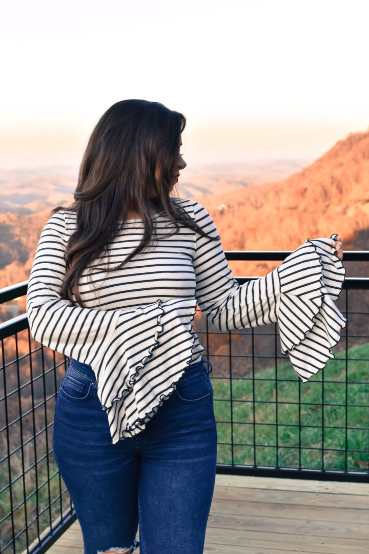 On the real, how fun is this top? If you check all your favorite fashion bloggers insta posts you’ll find them in this top, I’m sure. It’s so popular right now, and I’m just as in love with it as they are. The fabric is seriously the softest, ever! These sleeves are so much fun, too. Not only do they have a two-tier bell sleeve, but they also have a scalloped hem on the sleeves and the bottom of the shirt. So, SO cute. It’s a simple black and white top so a pop of color was necessary to add that little something extra. I chose red, but I will also pair it with hot pink, blue, and basically any color of choice.